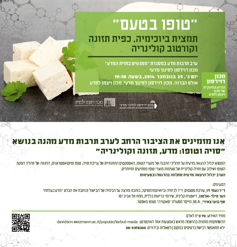 ביום ג', 25.11.2014, בשעה 19:30 ייערך ערב "סויה וטופו: מדע, תזונה וקולינריה", באולם הברווז, מכון דוידסון לחינוך מדעי, מכון ויצמן למדע.