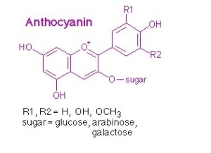 צבעם של האנתוצינינים תלוי בדרגת החומציות (ה- pH) של נוזל התא בו הם נמצאים. כשנוזל התא חומצי, צבעם אדום בוהק וכאשר הוא בסיסי, צבעם כחול-סגול. הם אלה שנותנים את הצבע האדום לדובדבנים, תפוחים, תותים, רימונים, חמוציות, וורדים, ואת הגוונים הכחולים-סגולים לחצילים, אוכמניות, כרוב סגול, תפוח-אדמה סגול, ענבים סגולים, פטל וסיגליות.