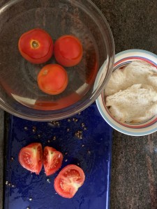 2ב) שיפור טעם 2: מסננים את הירקות מן הנוזל. משרים בו את פרוסות הלחם, במקום במים (ראו סעיף 1). מקפיאים את הירקות למשך מספר שעות, ואז מפשירים אותם, ומעבירים למיכל המערבל.