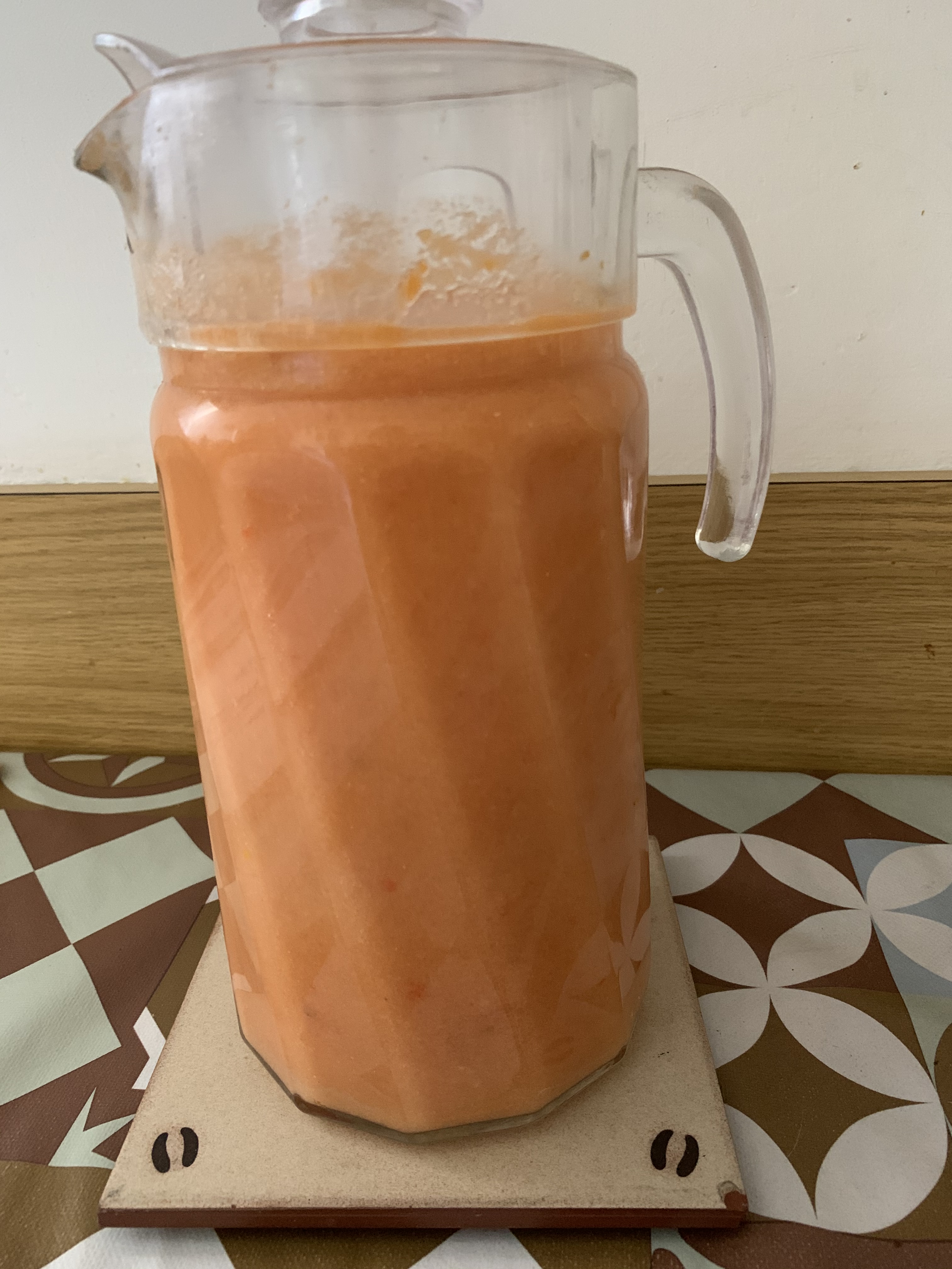 3) מערבלים את הירקות למחית חלקה, ומעבירים לקערה גדולה. אפשר להעביר דרך מסננת למרקם חלק.